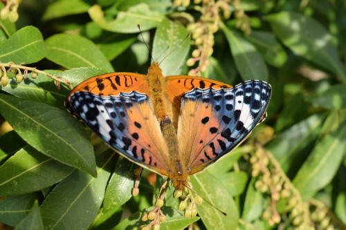 下のオレンジ色に黒の転々模様があるのがオスで、上の羽の先端に黒と白の模様があるのがメスなのだそうです。